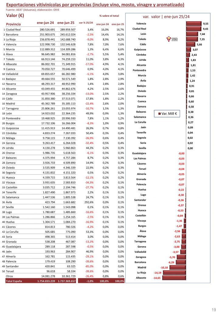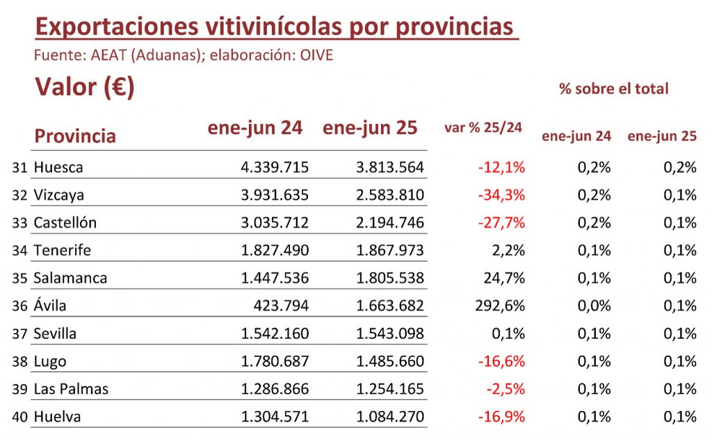 La información estadística está contenida en el análisis de junio elaborado por la Organización Interprofesional del Vino de España (OIVE), a partir de los datos facilitados por la Agencia Estatal de Administración Tributaria (AEAT), que compara la evolución de las exportaciones vitivinícolas por regiones y provincias.