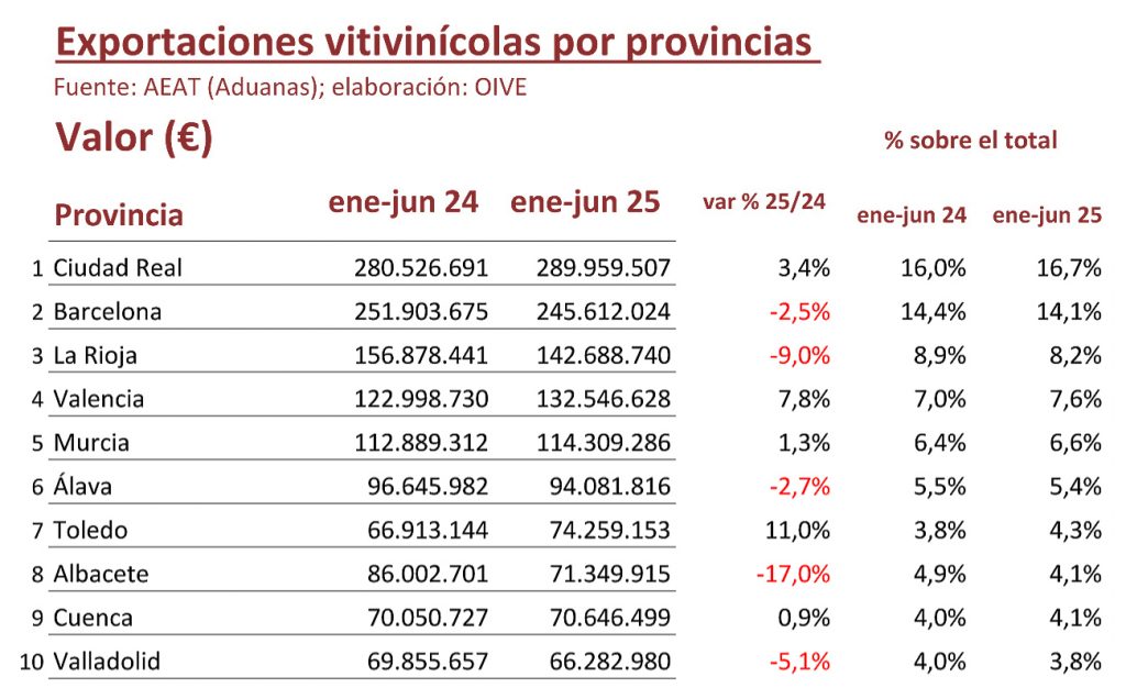 El top 10 de la exportación vitivinícola española está dominado por las grandes provincias productoras, empezando por la de Ciudad Real, auténtico epicentro mundial del vino, que alcanzó, entre enero y junio de 2025, casi 290 millones de euros de facturación, con un incremento del 3,4 % respecto al mismo período del año anterior. Por detrás, se situó Barcelona, que redujo sus ventas un 2,5 % hasta los 245.6 millones de euros y La Rioja, que cayó un notable 9 %, hasta los 142,6 millones de euros. Fuera del podio, aparecen Valencia y Murcia con 132,5 y 114,3 millones de euros, respectivamente. Y los puestos sexto al décimo se reservan, ya por debajo de 100 millones de euros, a las provincias de Álava, Toledo, Albacete, Cuenca y Valladolid. En resumen, claro predominio de Castilla-La Mancha, que incluye cuatro provincias entre las 10 primeras clasificadas, con el liderazgo incuestionable de Ciudad Real, que ha desplazado a Barcelona al segundo puesto y duplica holgadamente a La Rioja, tercera clasificada.