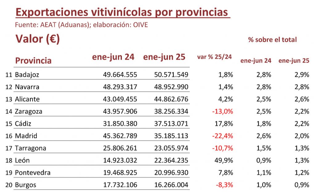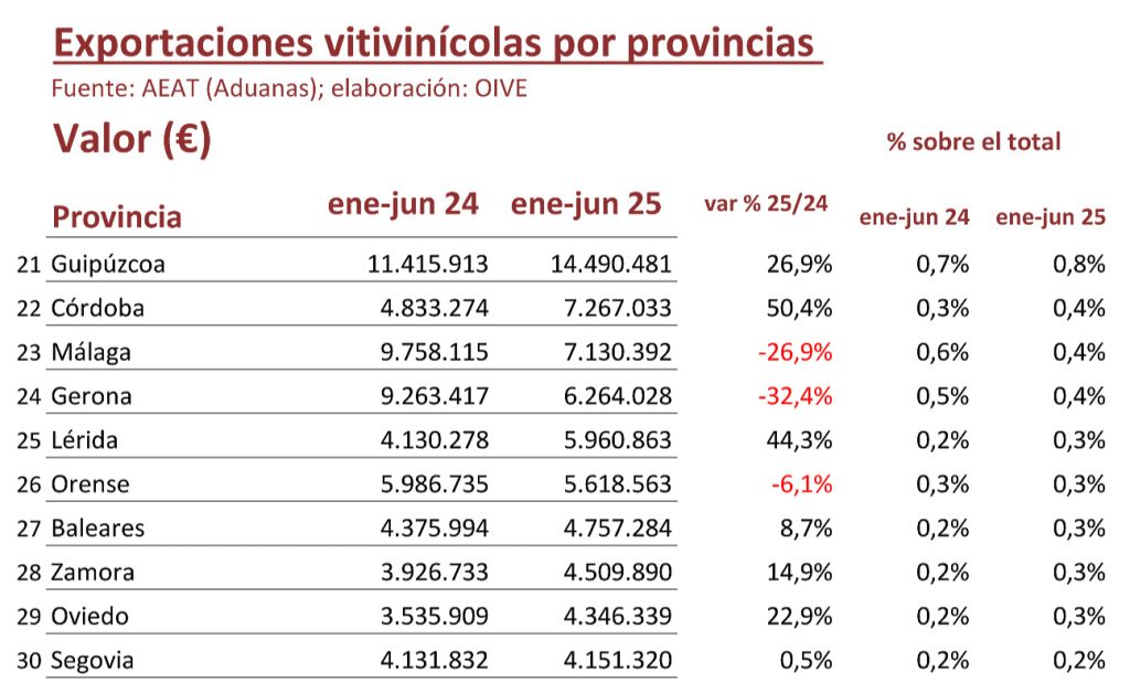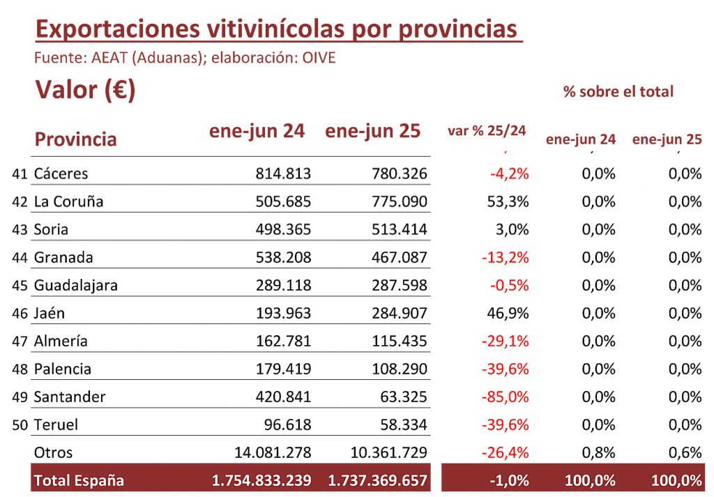 La revista Enólogos ofrece a sus lectores los datos de exportación de productos vitivinícolas de las 50 provincias españolas, ordenados de acuerdo a la facturación total de cada una de ellas. En una segunda entrega, se mostrará, asimismo, la clasificación en términos de volumen para disponer, de ese modo, de una radiografía completa y detallada de la evolución de la exportación provincial durante el primer semestre de 2025 respecto al mismo período del año anterior.